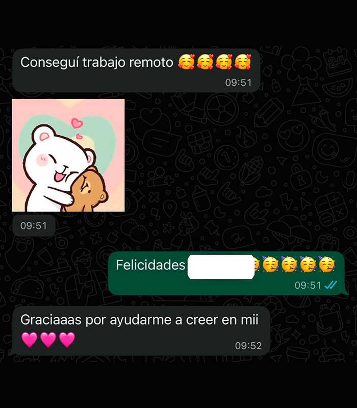 "Con Caro establecimos una ruta para conseguir una oportunidad en mi empresa soñada, tardó un tiempo pero lo logré, sobretodo me dio mucha confianza para las entrevistas"